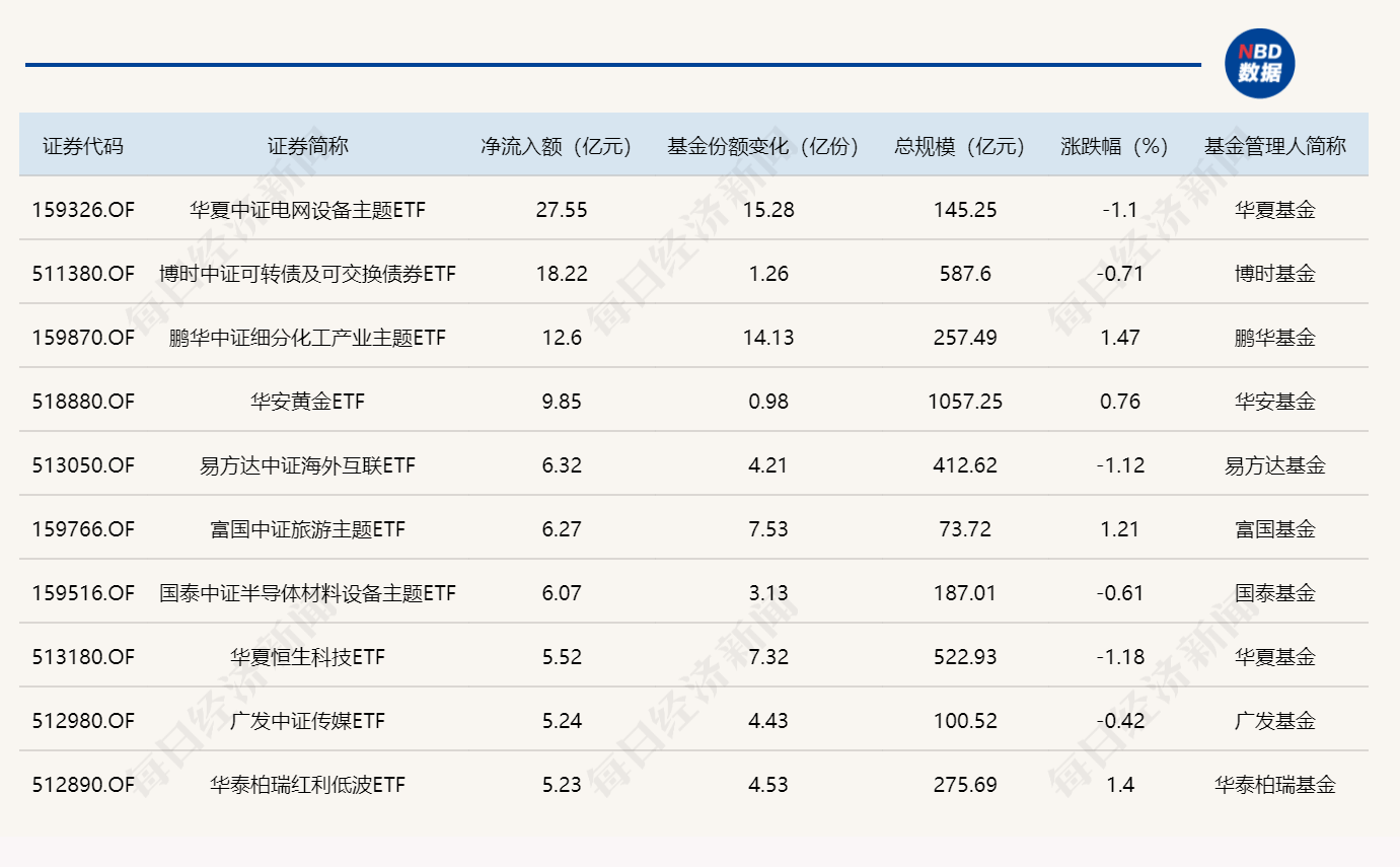 Wind数据显示,在1月20日的非货币ETF市场中,华夏中证电网设备主题ETF基金份额增加15.28亿份,净流入额27.55亿元;博时中证可转债及可交换债券ETF基金份额增加1.26亿份,净流入额18.22亿元;鹏华中证细分化工产业主题ETF基金份额增加14.13亿份,净流入额12.60亿元。